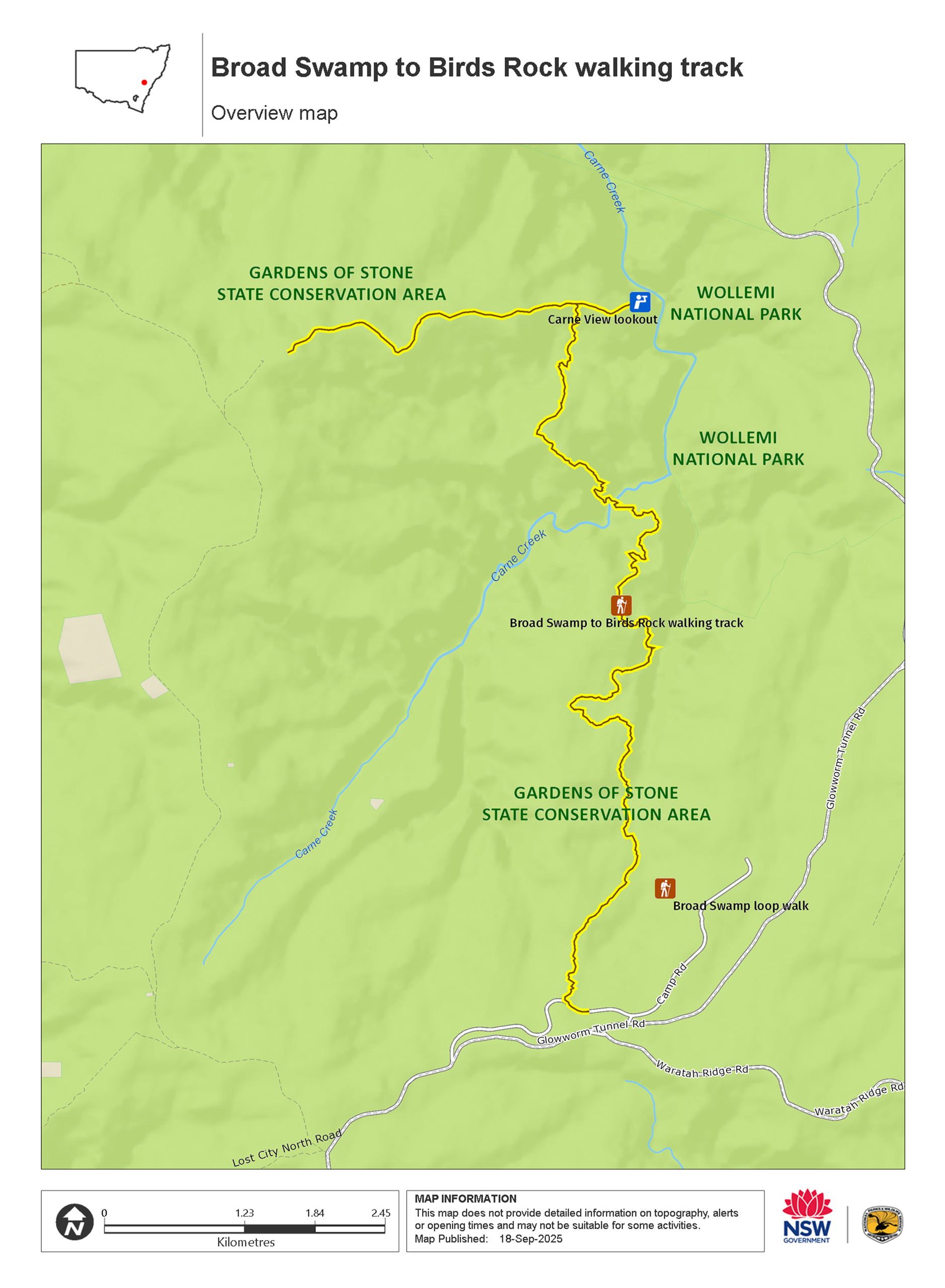 Broad Swamp to Birds Rock walking track is part of Gardens of Stone Pagoda Walk, a new 30km walk under construction. Learn more about this multi-day walk and other infrastructure upgrades planned for the park.
